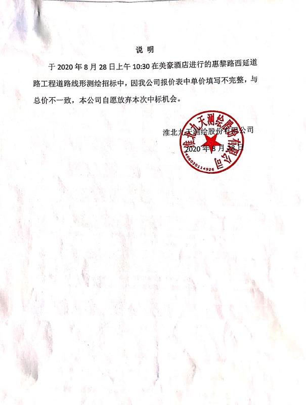 淮北市惠黎路西延道路工程 道路線形測繪詢價選聘第一中標候選人放棄中標資格公示
