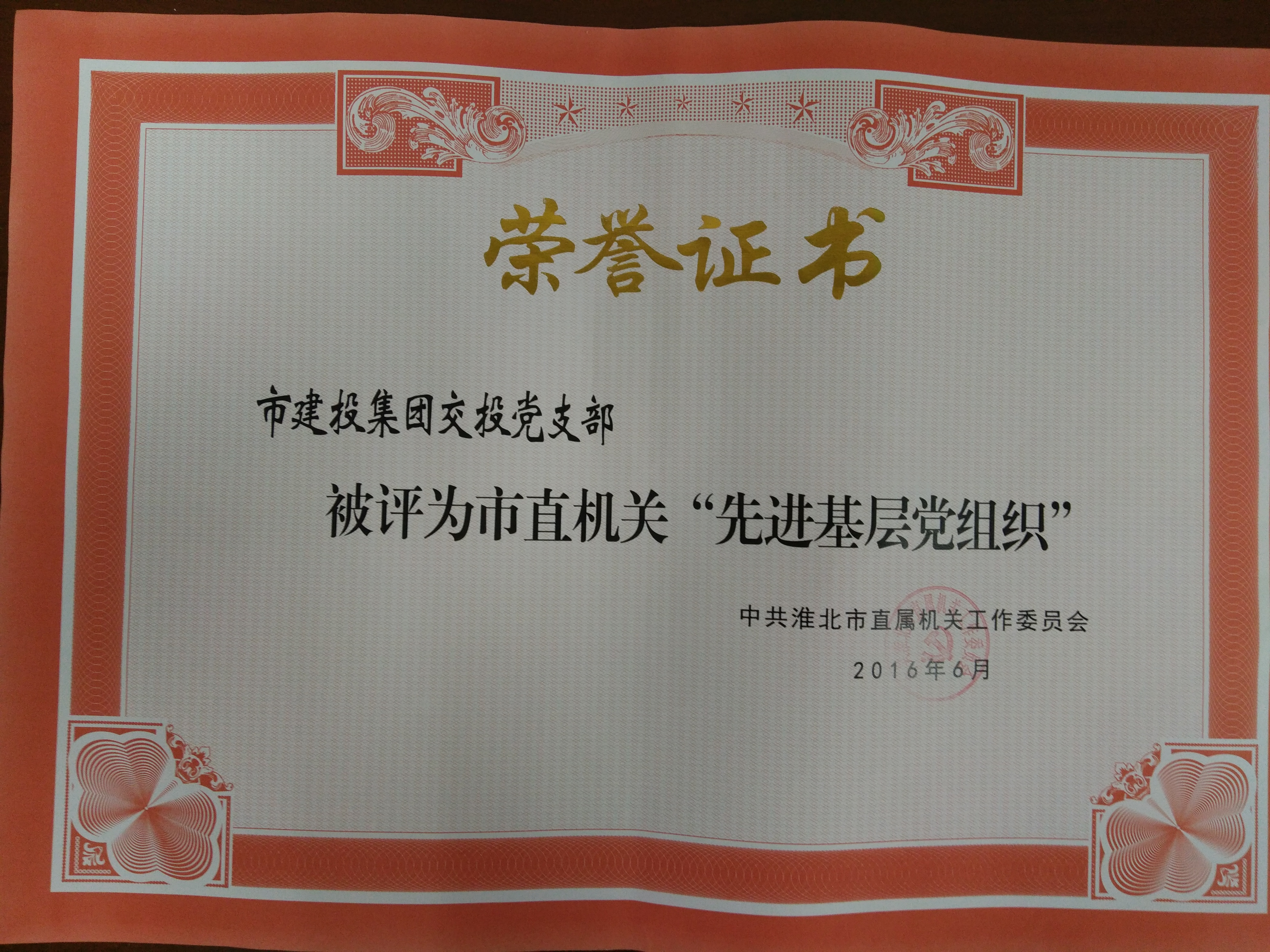 在慶祝中國共產(chǎn)黨成立95周年之際,市交投公司黨支部被授予“2016年度市直機(jī)關(guān)先進(jìn)基層黨支部”榮譽(yù)稱號。